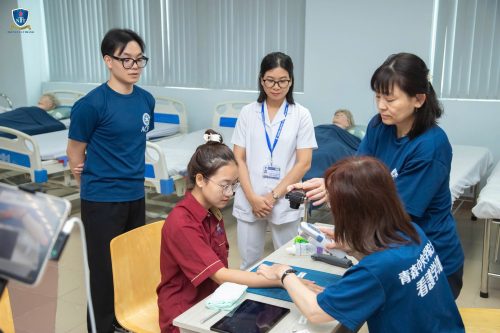 Trong chuyến thăm, Đoàn công tác đã có buổi làm việc cùng Khoa Điều dưỡng với mục tiêu hợp tác nghiên cứu trong dự án: “Làm sáng tỏ các vị trí lấy máu tĩnh mạch an toàn ở chi trên và mu bàn chân của người Nhật Bản và người Châu Á khác”.