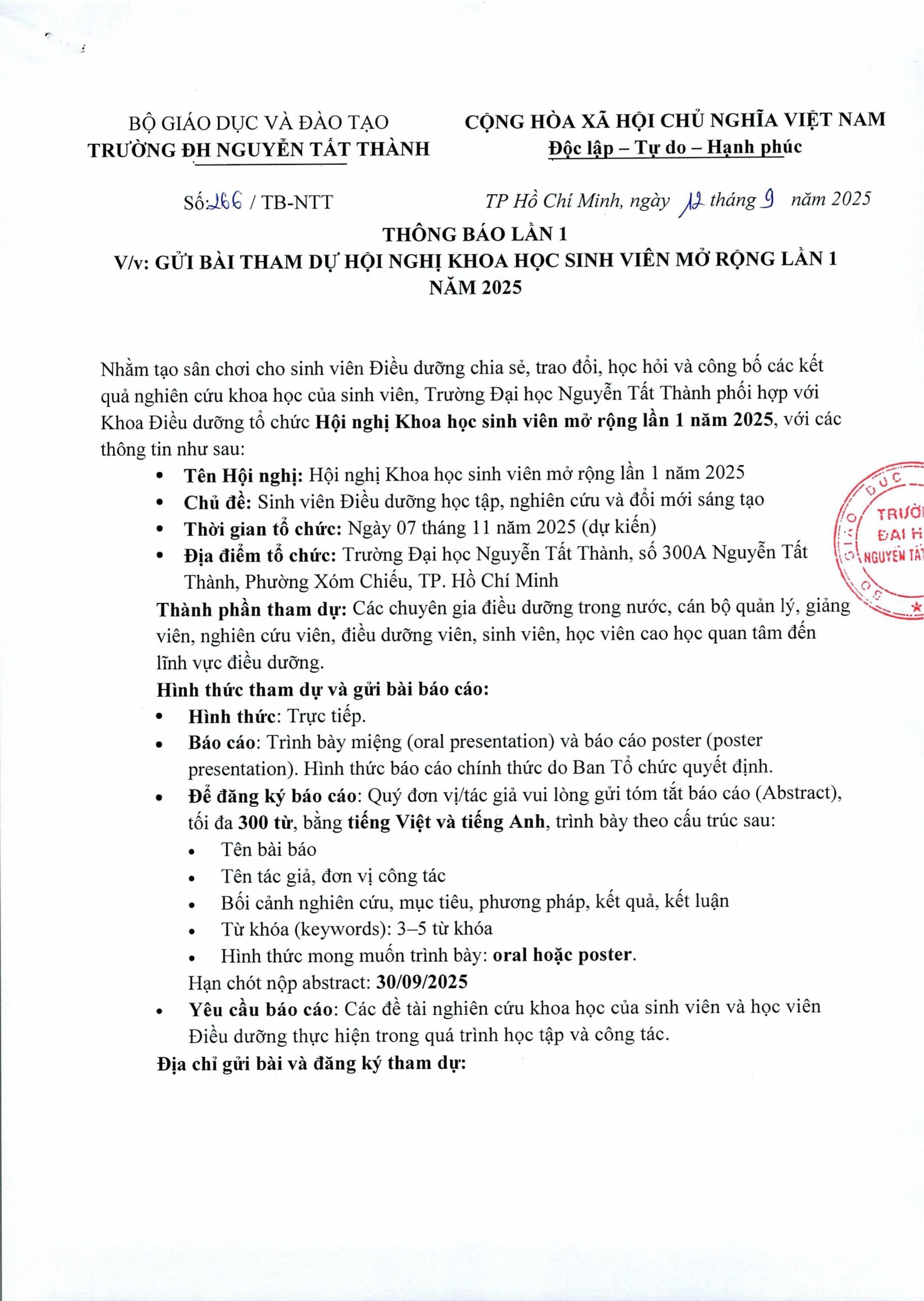Thông báo Hội nghị khoa học sinh viên mở rộng lần 1 năm 2025-hình ảnh-0 Published 6:13 pm 20/09/2025 at 1818 × 2560 in Thông báo tổ chức Hội nghị Khoa học sinh viên Điều dưỡng mở rộng lần 1 – Năm 2025 ← Previous